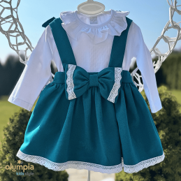 Przedstawiamy uroczą spódniczkę z szelkami, ozdobioną dużą kokardą i delikatną bawełnianą koronką, dostępną w dwóch eleganckich kolorach: głębokie bordo i szlachetnej zieleni. W komplecie białe body z falbanką przy dekolcie, które idealnie dopełnia całość.