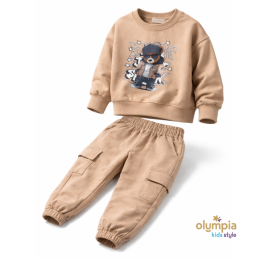 Uroczy nadruk na przodzie bluzy dodaje całości charakteru i sprawia, że komplet wyróżnia się na tle innych dziecięcych stylizacji. To idealny strój zarówno do przedszkola, na spacer, jak i na domowe harce.