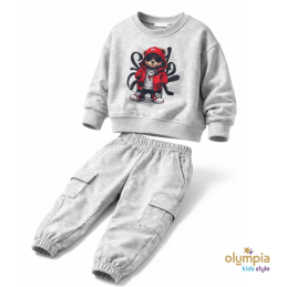 Uroczy nadruk na przodzie bluzy dodaje całości charakteru i sprawia, że komplet wyróżnia się na tle innych dziecięcych stylizacji. To idealny strój zarówno do przedszkola, na spacer, jak i na domowe harce.