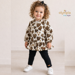 Piękny zestaw dla małych księżniczek - tunika z legginsami! Ta niezwykle urocza kreacja jest doskonała dla każdej małej modnisi. Tunika o lekkim kroju zdobi wzór panterkowych serc w modnej czekoladowej kolorystyce, które wyczarują uśmiech na każdej twarzy, na dole ozdobne falbany.
