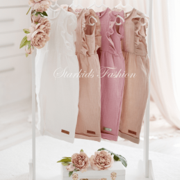 Witamy w świecie letniej elegancji i komfortu! Przedstawiamy nasz wyjątkowy kombinezon z muślinu dla dziewczynki, stworzony z myślą o beztroskich, ciepłych dniach pełnych zabawy i przygód. Ten uroczy kombinezon to kwintesencja letniego stylu, który zachwyca swoją subtelną, pastelową kolorystyką i delikatnymi ozdobnymi falbankami.