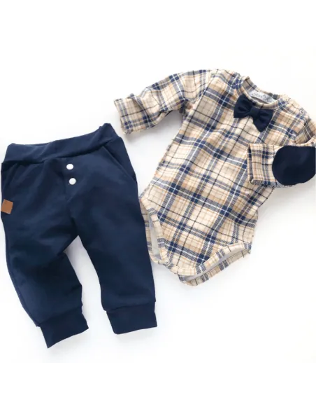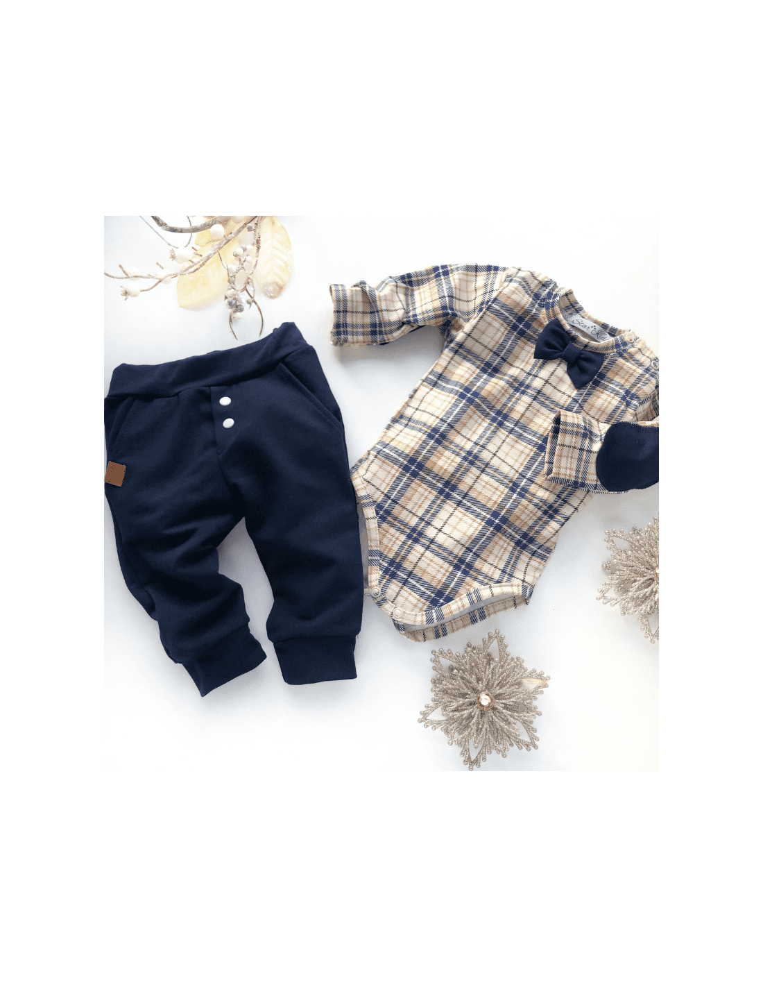 Piękne połączenie wygody i elegancji. Body z muszką pięknie kontrastują z granatowymi spodniami.