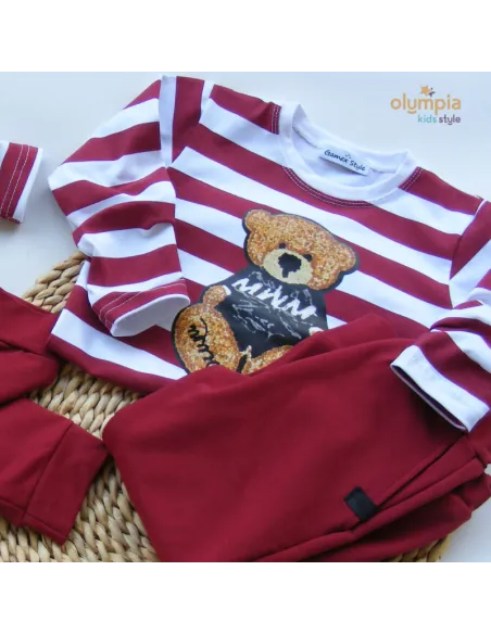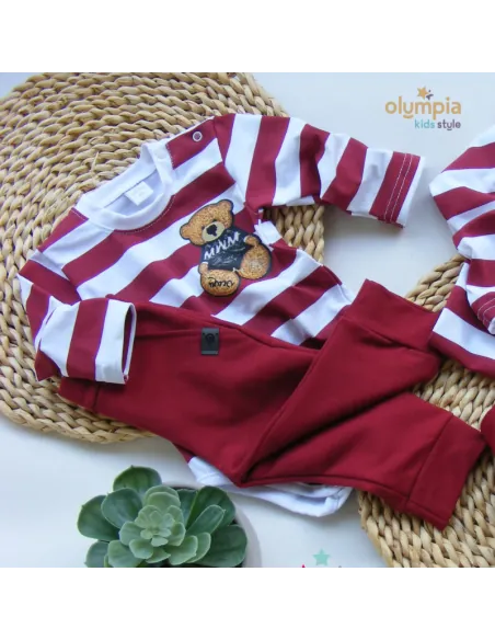- Stylowy design: Body w modnych bordowo-białych paskach z uroczym nadrukiem misia na przodzie, które z pewnością przypadnie do gustu każdemu maluchowi.