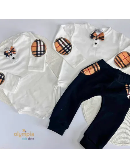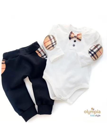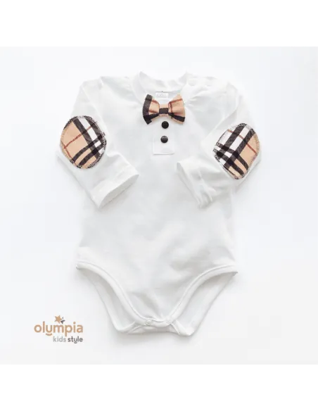 Body niemowlęce w kolorze białym, zapinane na guziczki w stylu polo, które nadaje eleganckiego charakteru. Subtelna kraciasta muszka, idealnie dopasowana do całości, dodaje uroku, a łatki na rękawach nawiązują do klasycznego stylu.