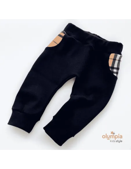 Czarne spodenki wykonane z wysokiej jakości prążkowanej dzianiny, zapewniają komfort noszenia i swobodę ruchów. Spodenki wykończone są ściągaczami na dole nogawek, a gumka w pasie gwarantuje idealne dopasowanie do sylwetki. Kieszenie są imitowane, z dyskretnymi akcentami kratki, które komponują spójnie z muszką na body, tworząc harmonijną całość.