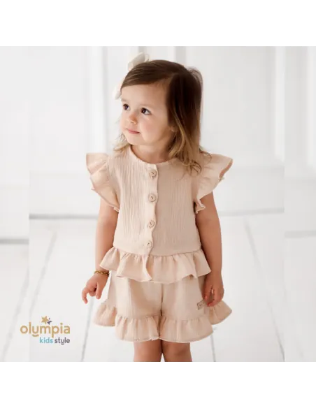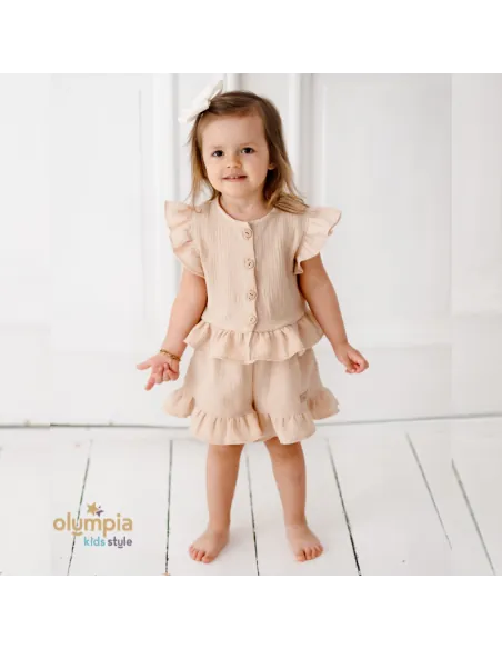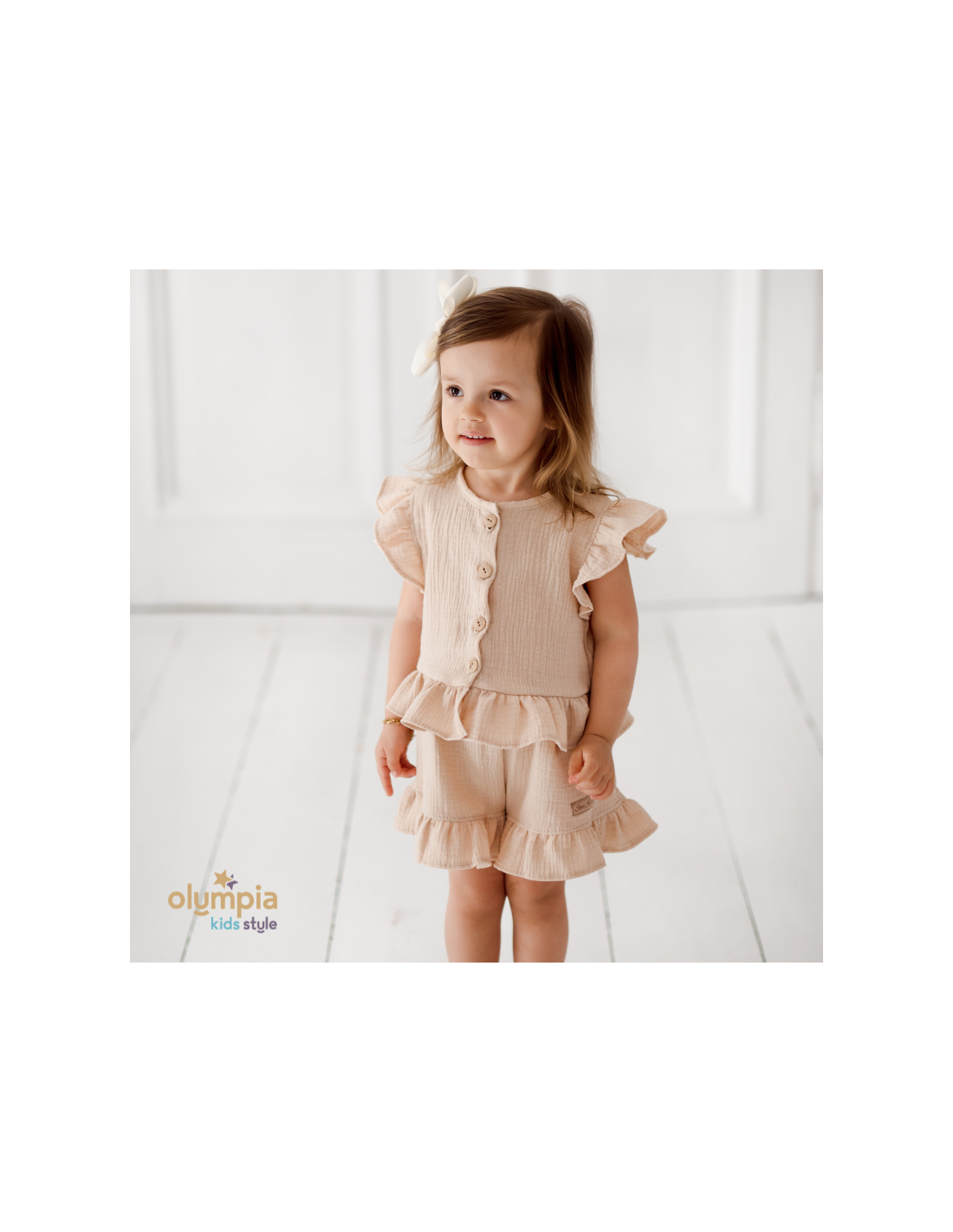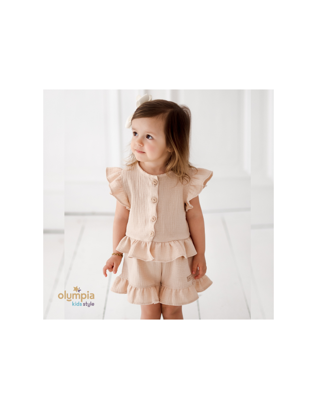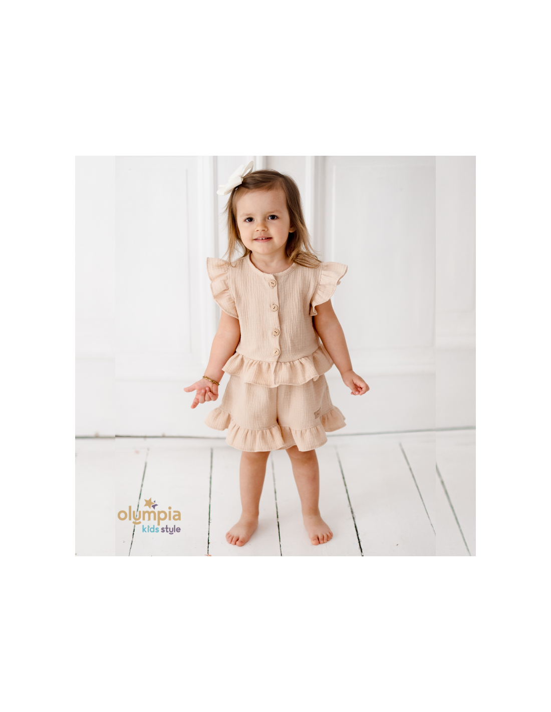 Komplet z Muślinu dla dziewczynki- Bluzka zapinana na guziczki i Spodenki beż