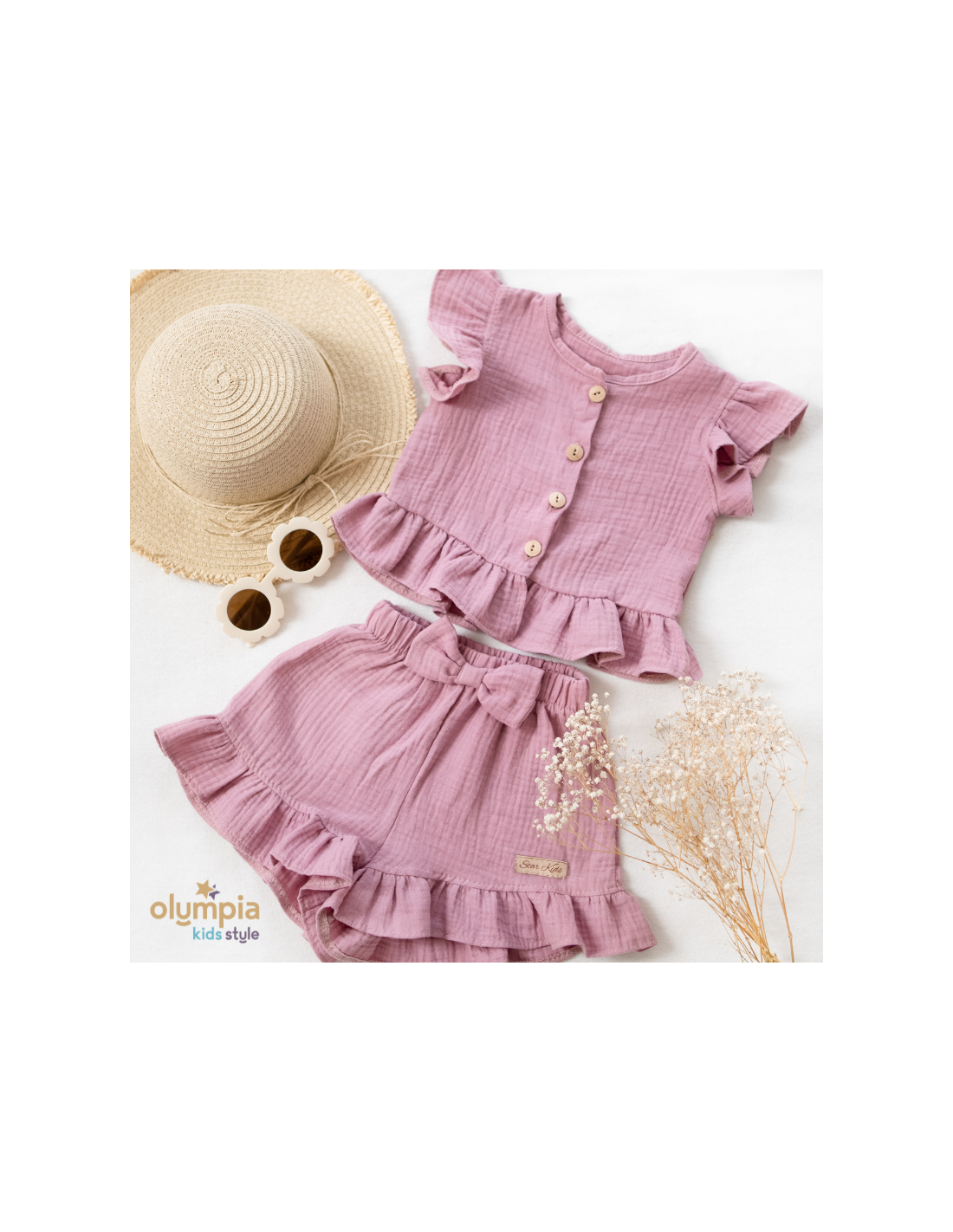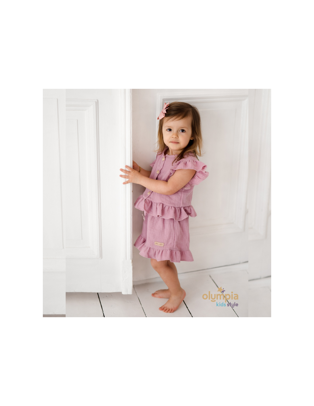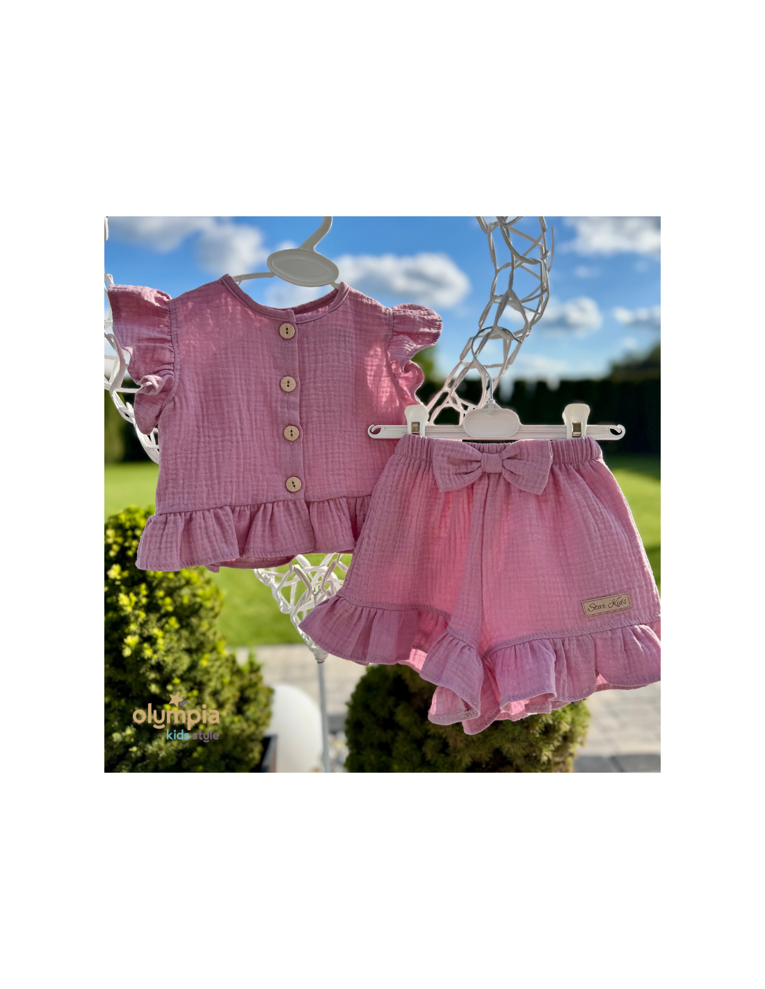Komplet dziewczęcy z Muślinu Bluzka i Spodenki pudrowy róż