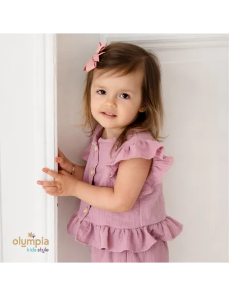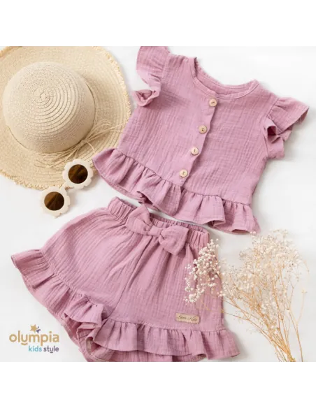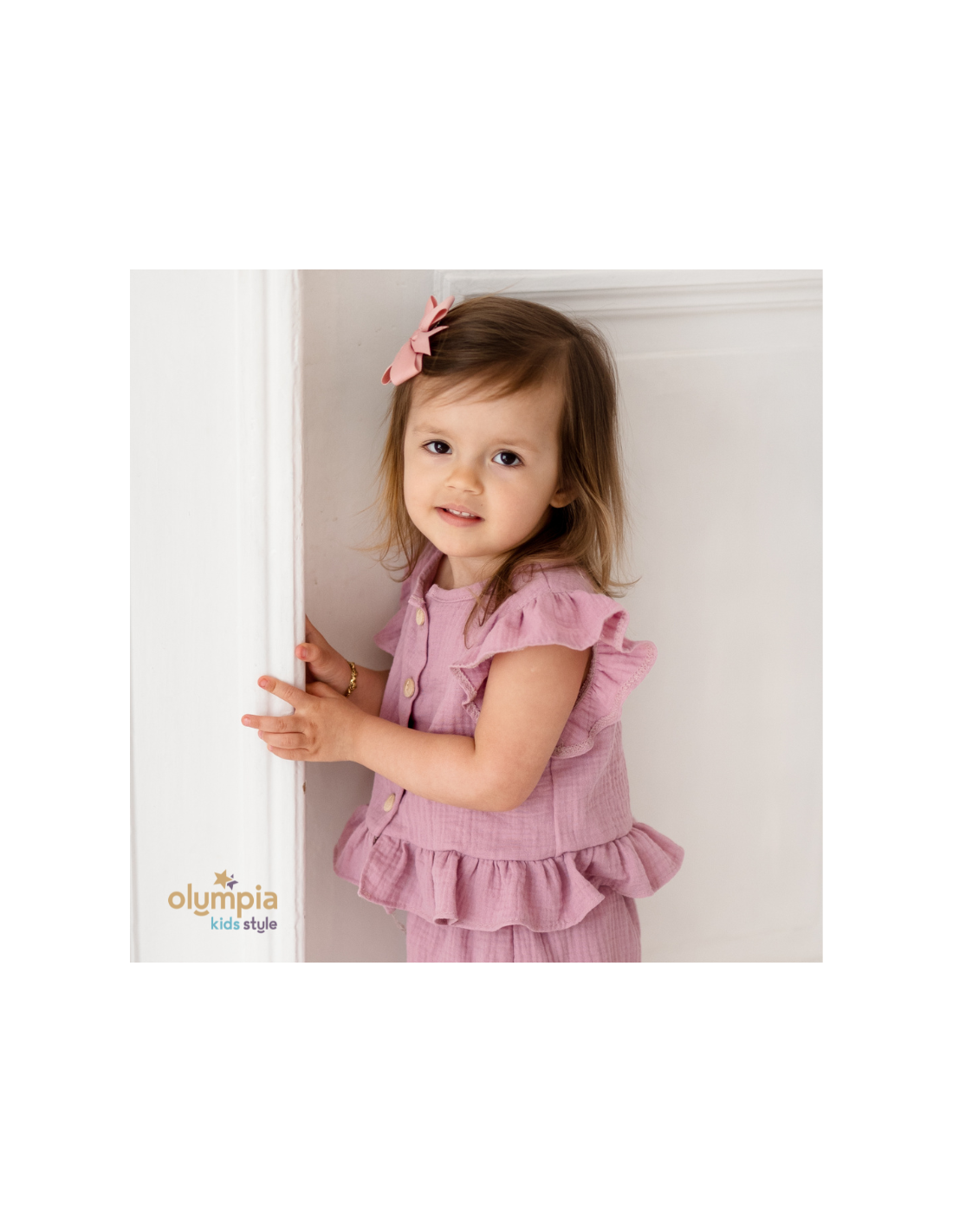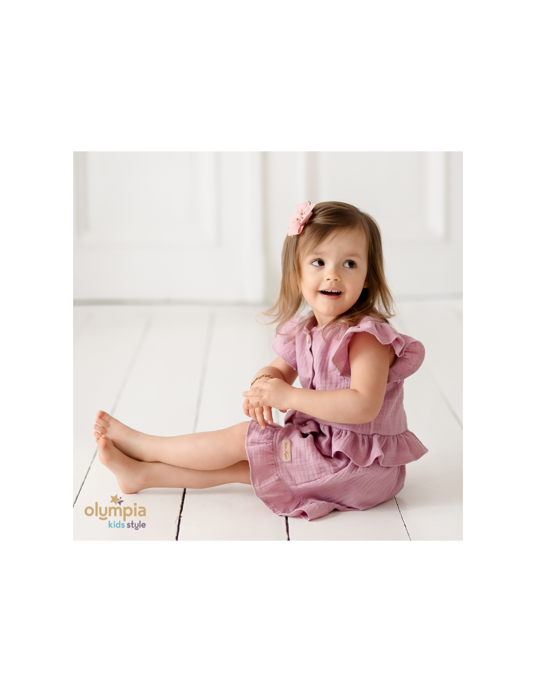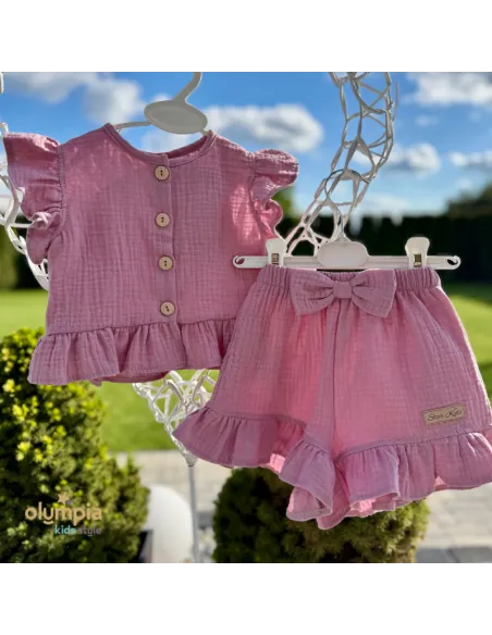 Komplet dziewczęcy z Muślinu Bluzka i Spodenki pudrowy róż