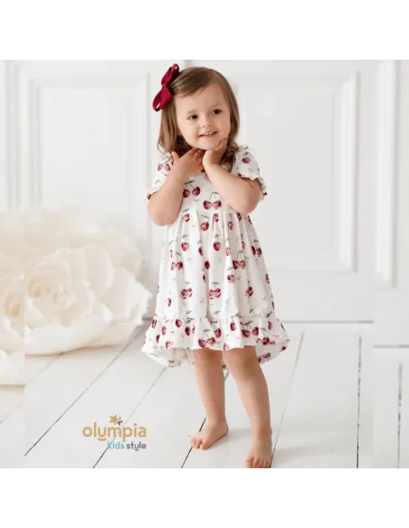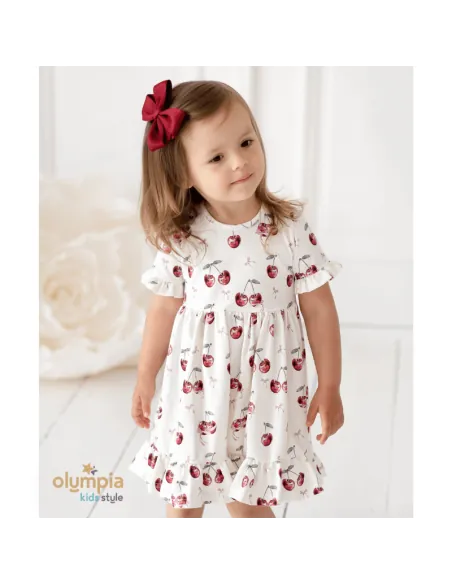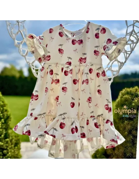Sukienka zachwyca pięknym wzorem soczystych wisienek na ecru tle, co nadaje jej wyjątkowego uroku i elegancji.