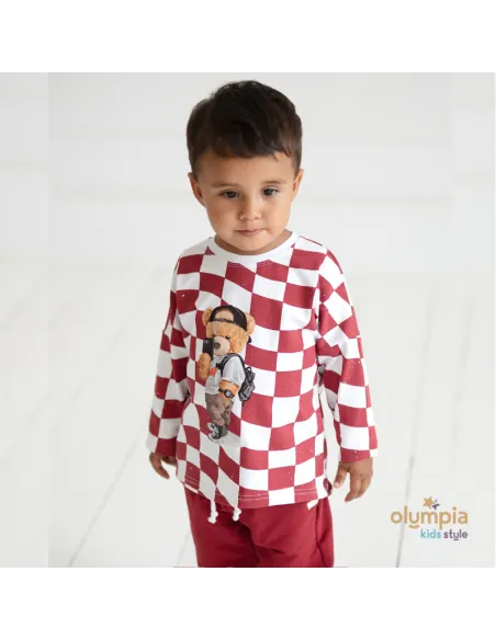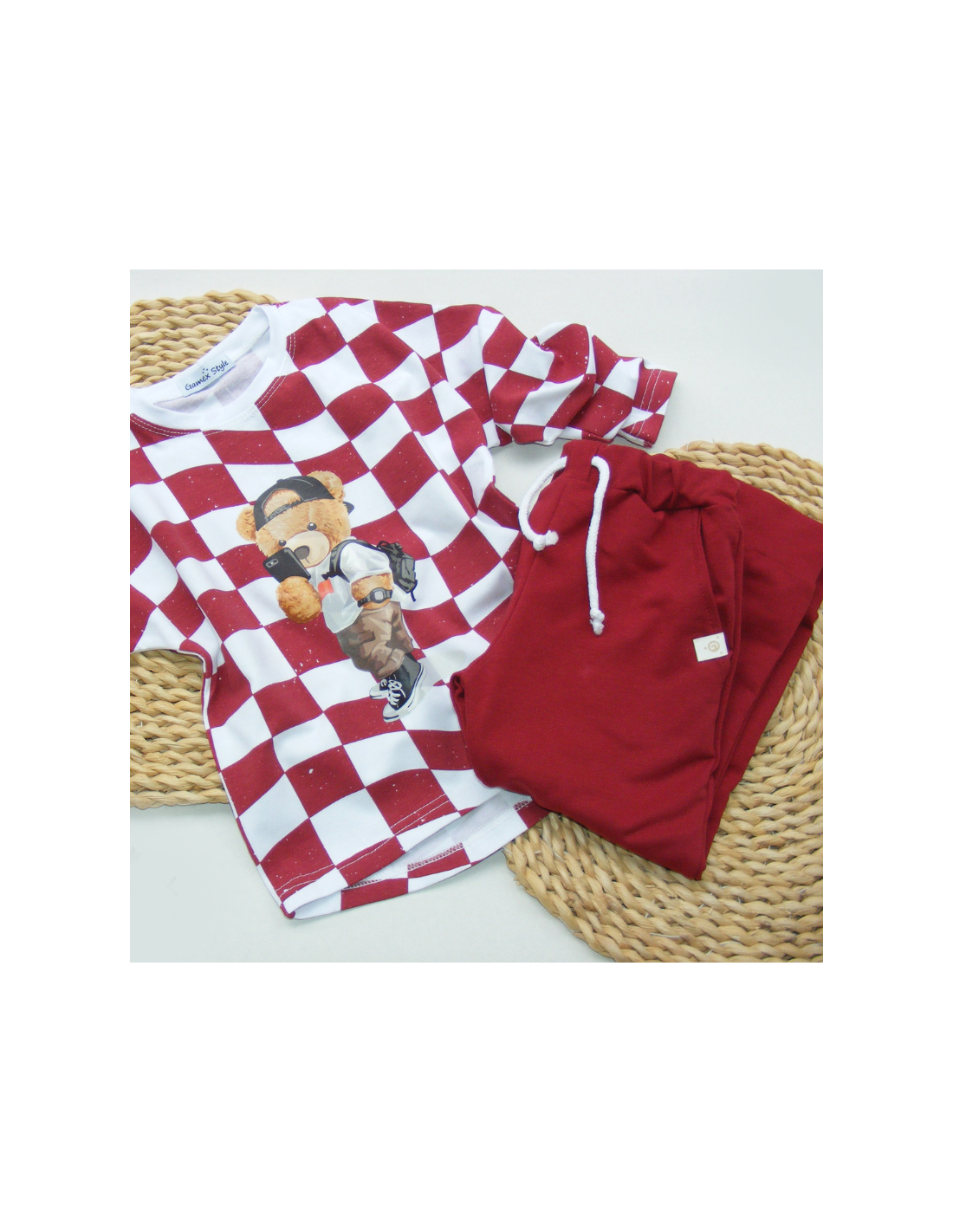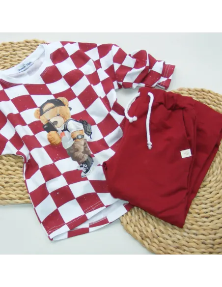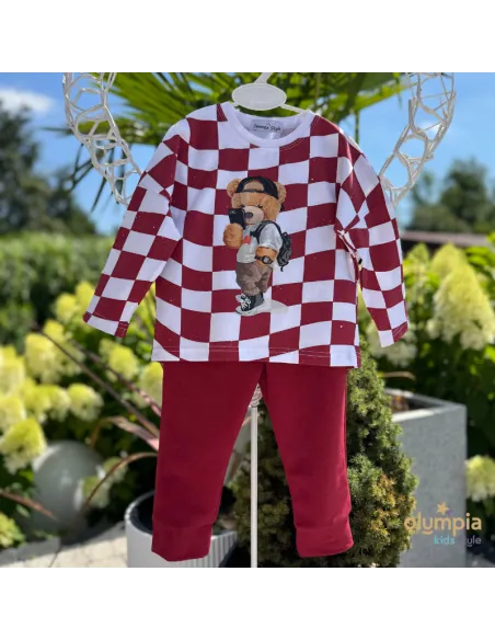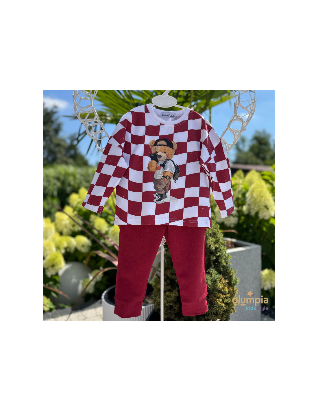 - Stylowy design: Body w modnym bordowo-białym printem szachownicy z uroczym nadrukiem misia na przodzie, które z pewnością przypadnie do gustu każdemu maluchowi.