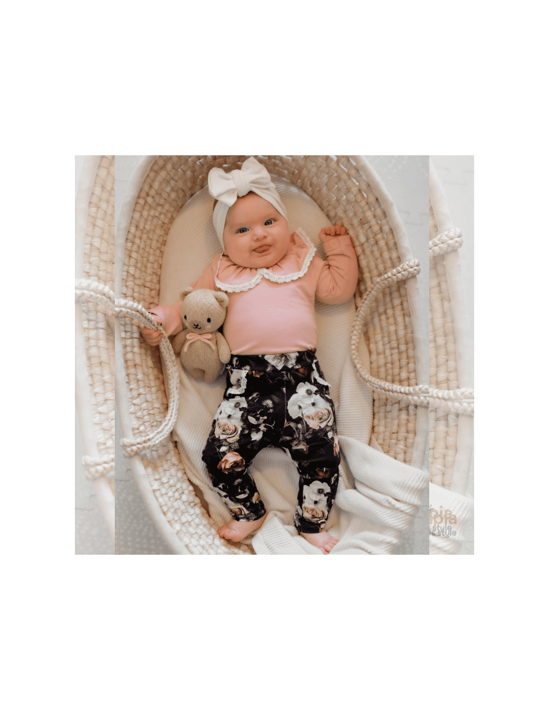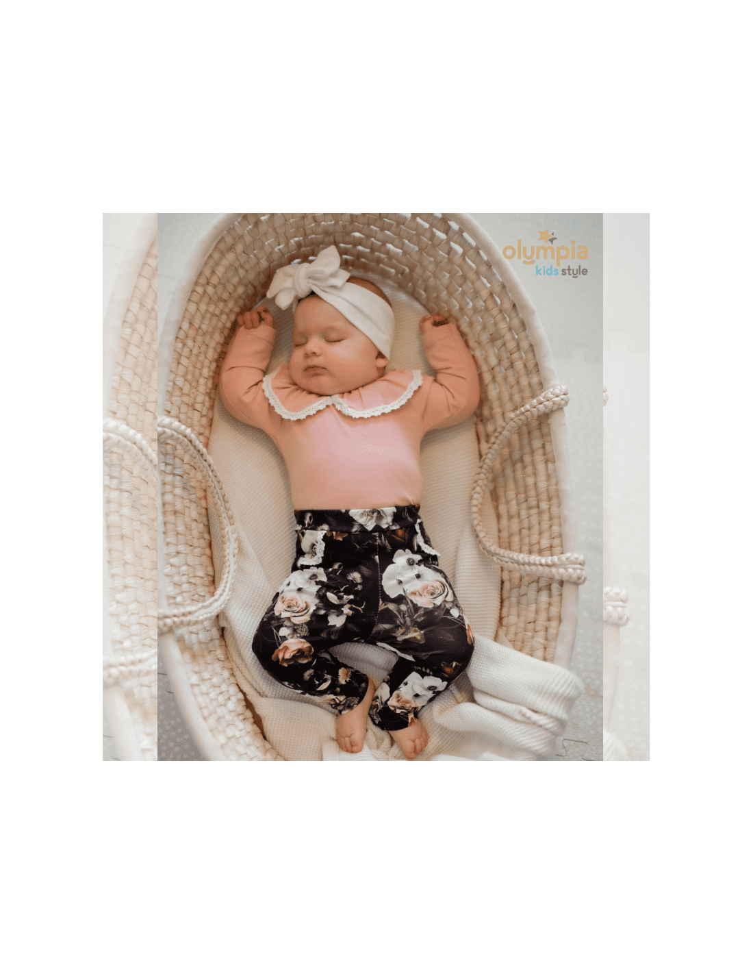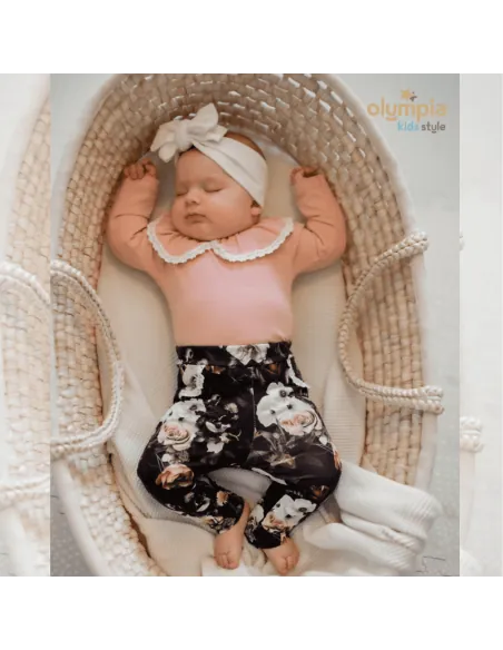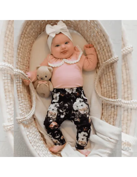 Komplet niemowlęcy – body pudrowy róż z koronką + kwiatowe legginsy