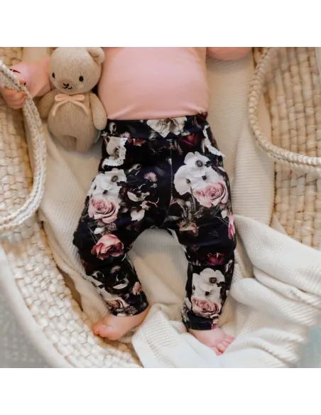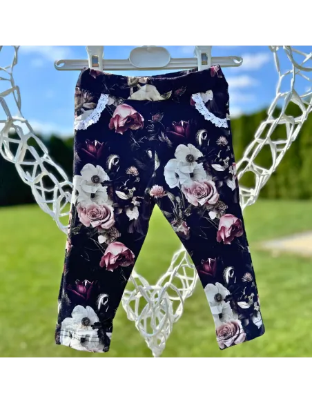 Legginsy ozdobione są zachwycająco pięknym wzorem kwiatów na ciemnym tle, co nadaje wyjątkowego uroku i elegancji , świeżości i radości każdej stylizacji. To świetny wybór na spacery, zabawy na świeżym powietrzu czy jako element casualowego zestawu do żłobka lub przedszkola.