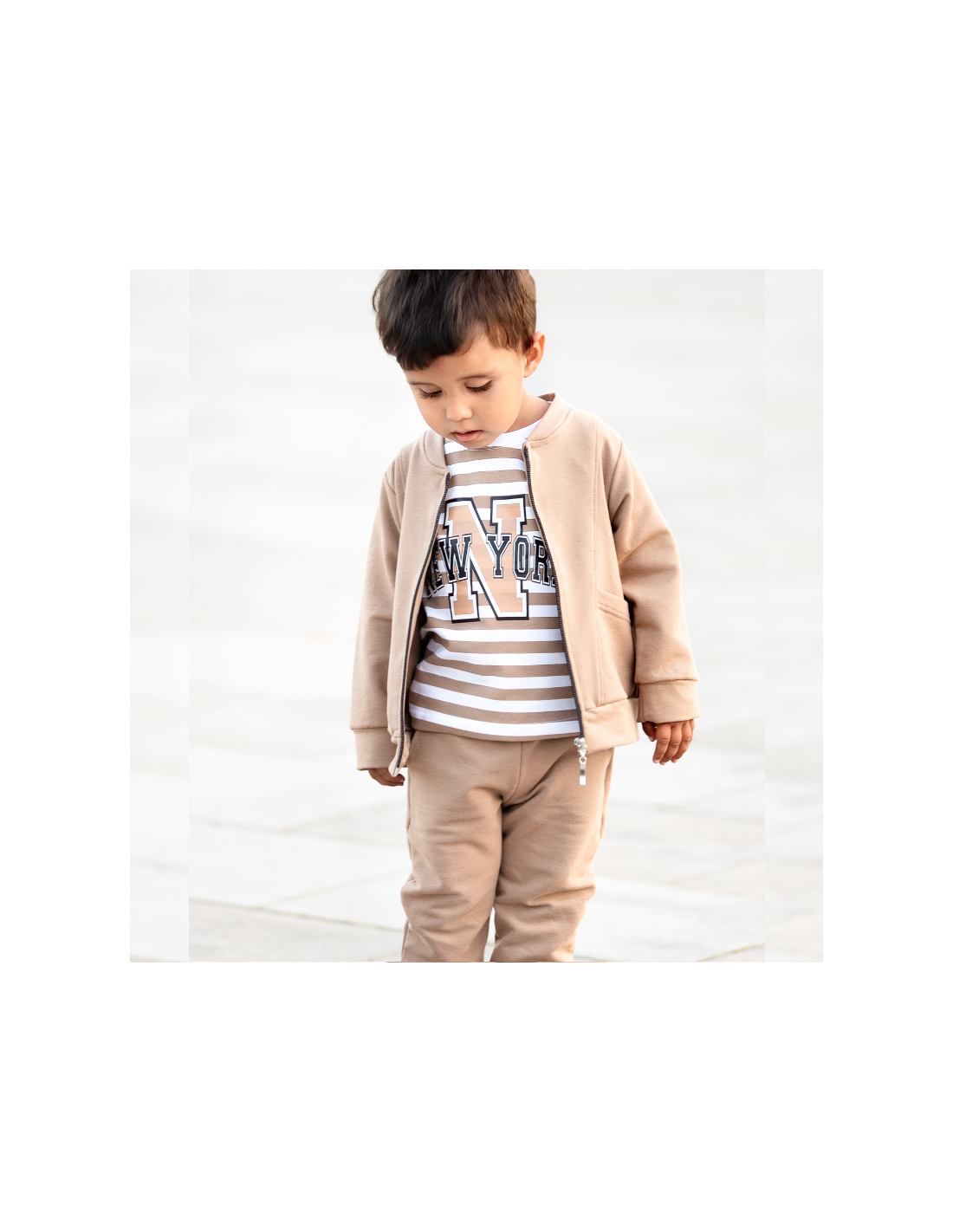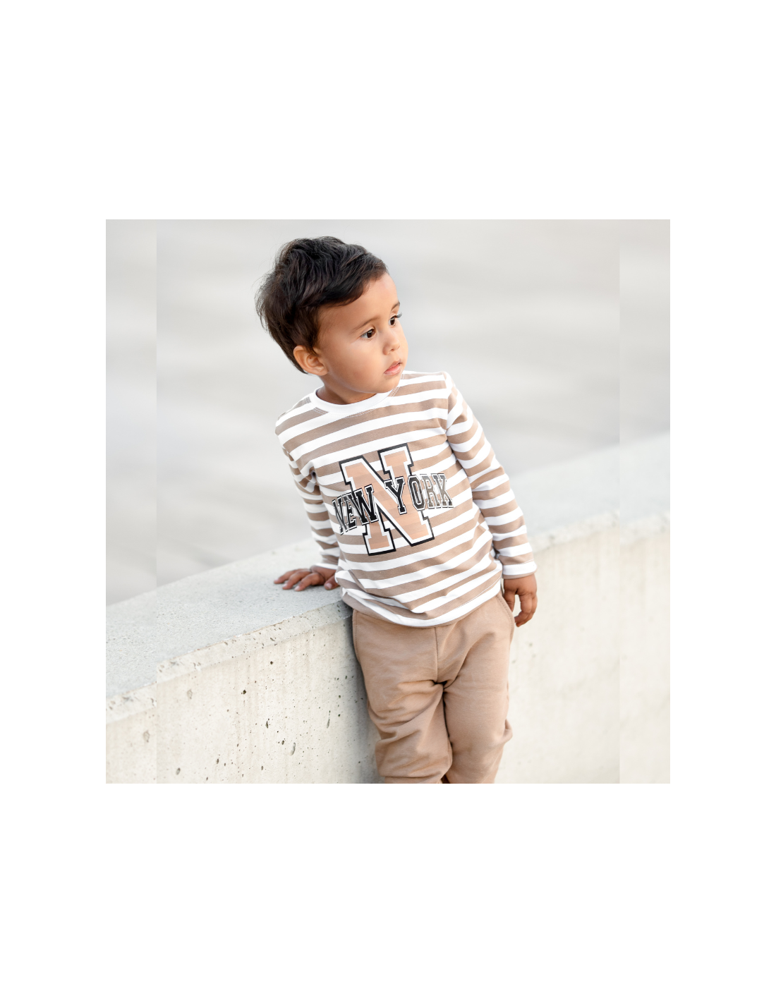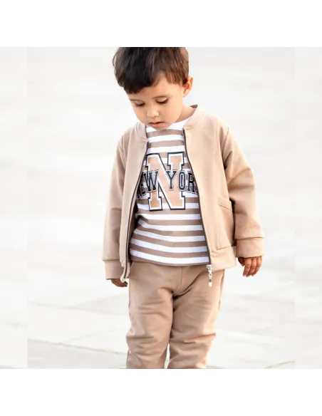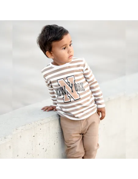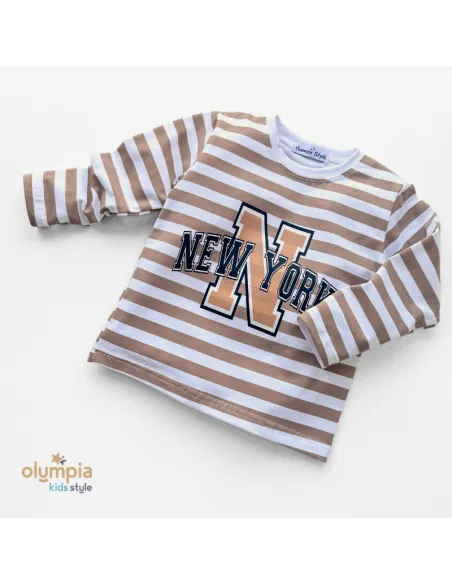 lBuzka dziecięca w biało-beżowe paski z napisem NEW YORK to idealne uzupełnienie do dresu Tymek. Wykonana z miękkiej i przyjemnej w dotyku bawełny, zapewnia komfort noszenia na co dzień. Klasyczny krój z długim rękawem sprawdzi się zarówno w chłodniejsze dni, jak i jako wygodna warstwa pod bluzę. Modny nadruk w stylu college nadaje całości sportowego charakteru, dzięki czemu bluzka doskonale komponuje się z dresami, jeansami czy legginsami.