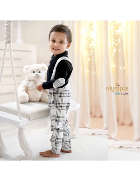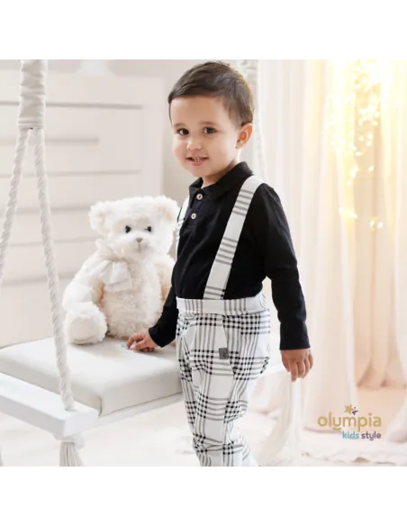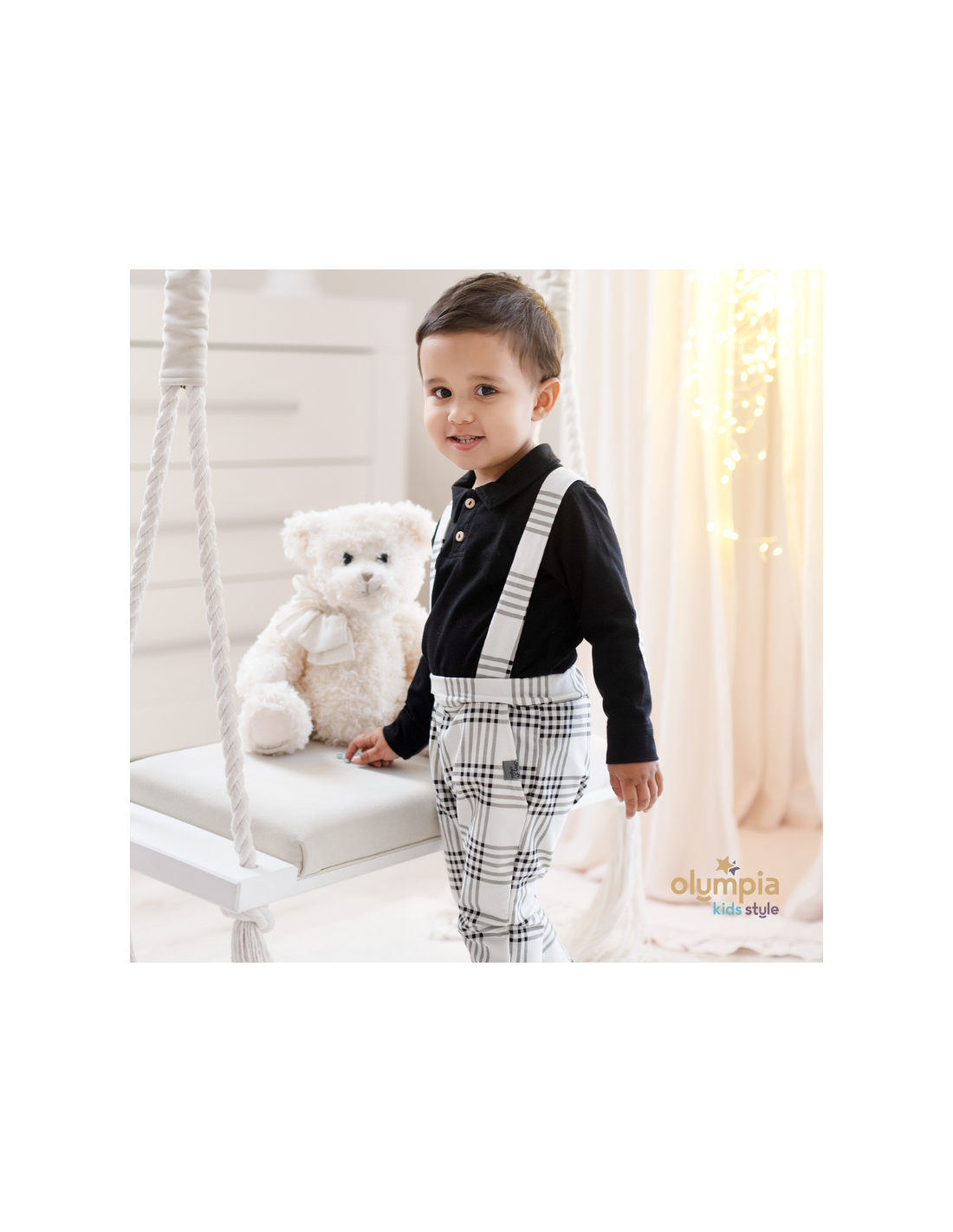 Bezpieczny, bawełniany komplet niemowlęcy składający się z bluzki z kołnierzykiem oraz spodenek z szelkami. Produkt polskiego producenta, certyfikat Bezpieczny dla Dziecka. Idealny na co dzień i na wyjątkowe okazje