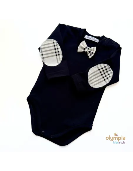 Body w kolorze czarnym zostało ozdobione uroczą muszką oraz łatkami na rekawie, co nadaje całości szyku i wyjątkowego charakteru. Spodnie na szelkach zapewniają swobodę ruchów i doskonałe dopasowanie, nie uciskając brzuszka dziecka.