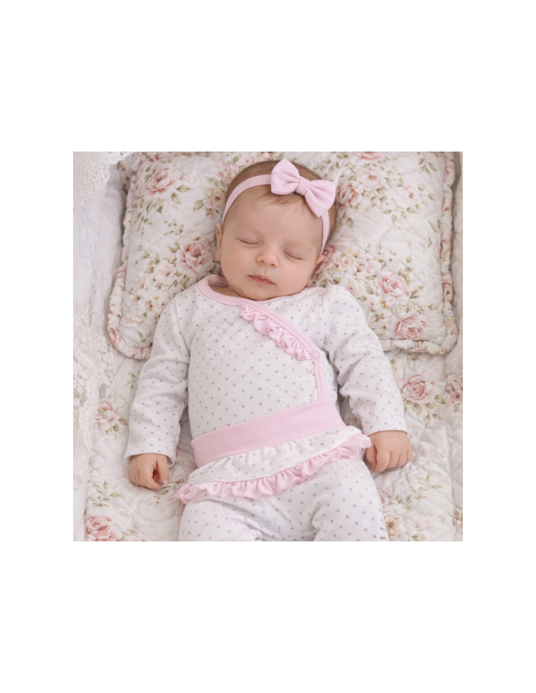 Półśpiochy z zakrytymi stópkami – ozdobione delikatną falbanką i karczkiem z bezuciskową gumką w pasie, która jest niezwykle delikatna dla pępuszka noworodka i brzuszka.