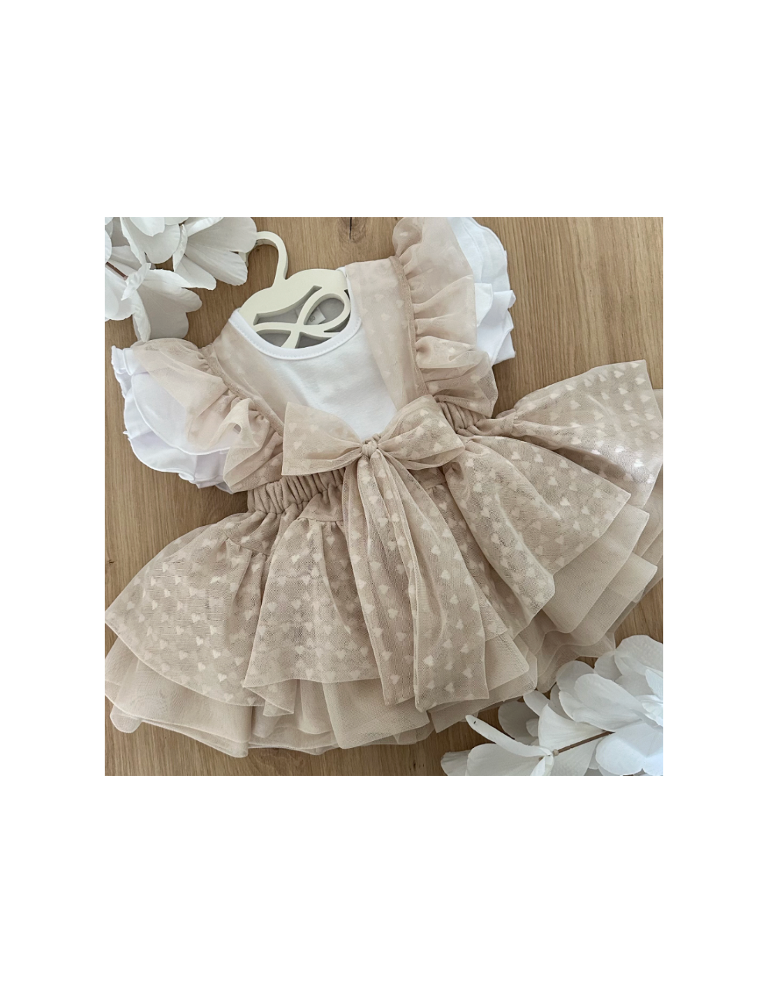 Beżowa spódniczka na szelkach z trzech warstw tiulu z printem serduszek.