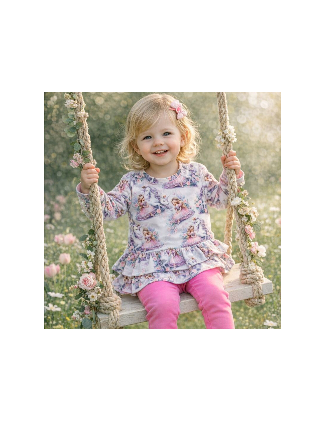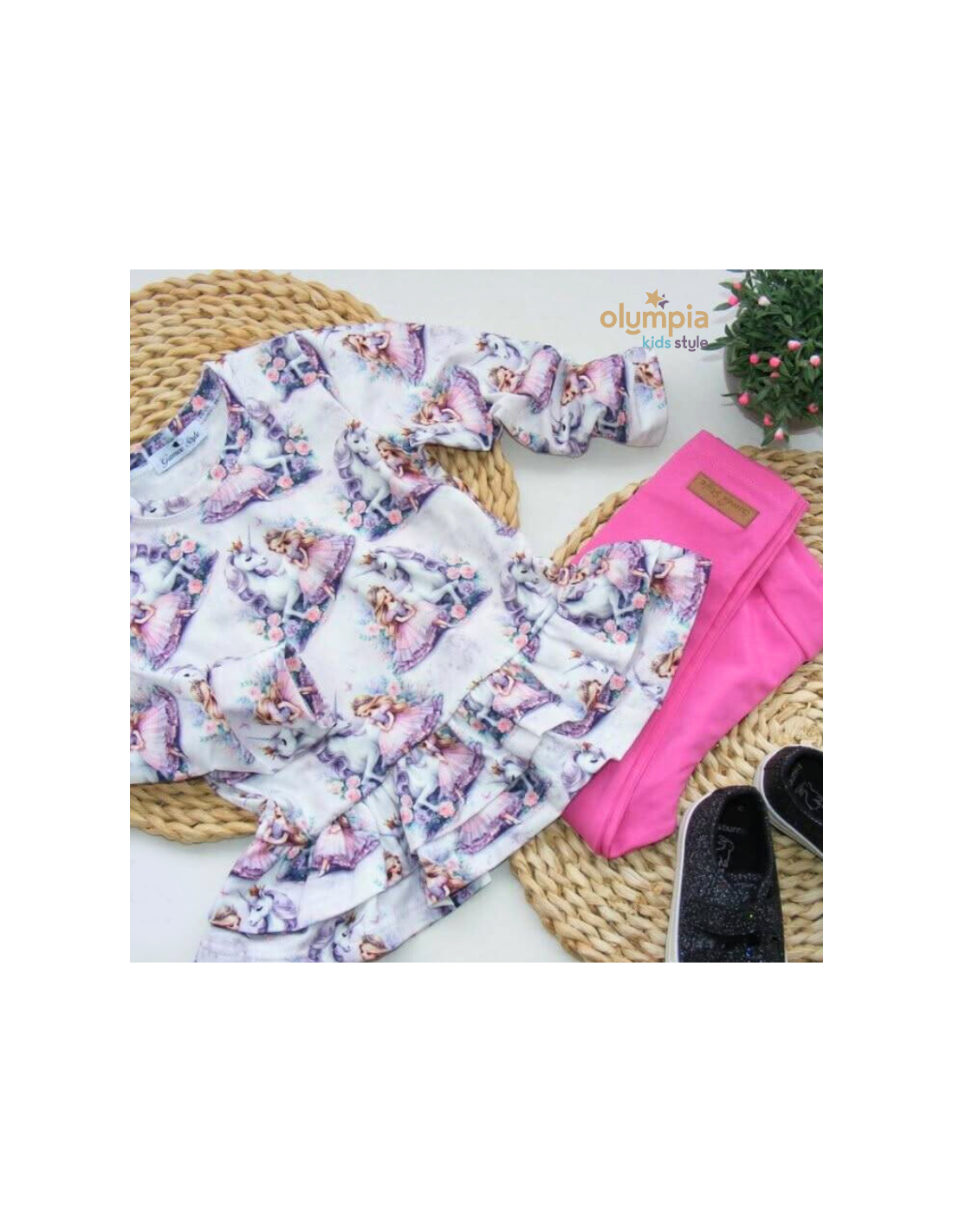 Piękny zestaw dla małych księżniczek - tunika z legginsami i! Ta niezwykle urocza kreacja jest doskonała dla każdej małej modnisi. Tunika o lekkim kroju zdobi wzór baśniowych jednorożców i księżniczek, które wyczarują uśmiech na każdej twarzy.