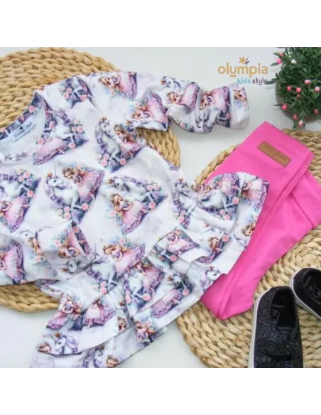 Dół tuniki z falbankami nadają całości dziewczęcy wygląd sprawiając, że malutkie damy poczują się jak prawdziwe księżniczki. Jasne tło zestawu sprawia, że wzór jest jeszcze bardziej wyrazisty i zachwycający.