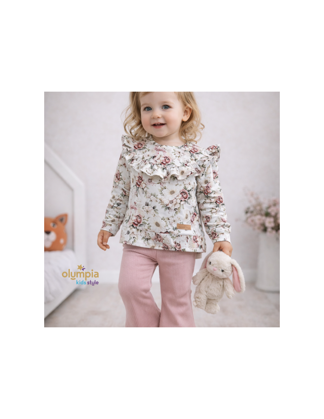 Jeden z wyróżniających się elementów jest także piękny, charakterystyczny nadruk w różnych odcieniach pudrowego różu i beżu. Nadaje to komplecikowi unikalnego charakteru i sprawia, że ​​produkt prezentuje się niezwykle efektownie. Taki zestaw może być idealnym rozwiązaniem na urodziny czy wyjście na spacer.
