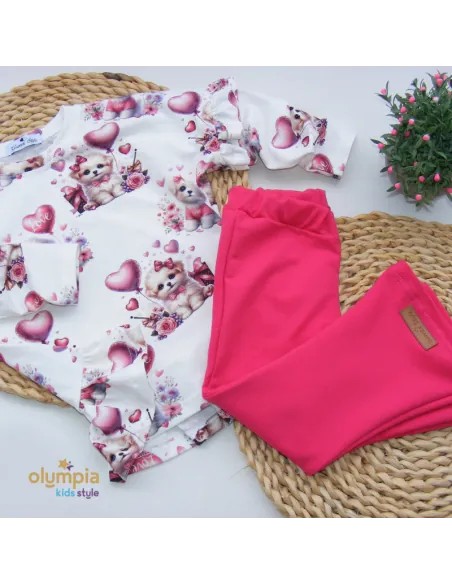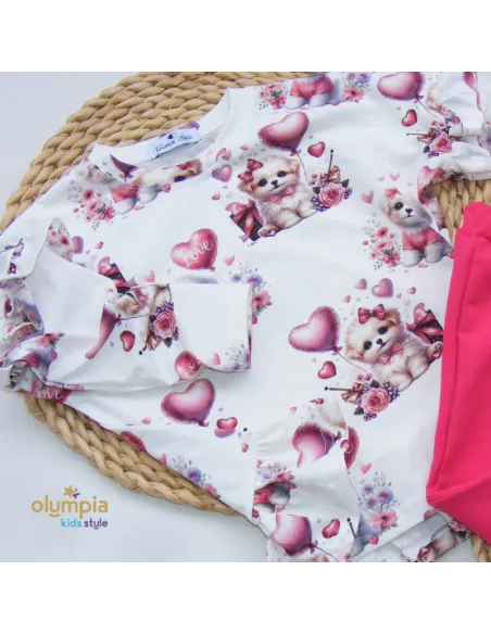 Piękny zestaw dla małych księżniczek - bluzka i spodnie dzwony! Ta niezwykle urocza kreacja jest doskonała dla każdej małej modnisi. Bluzka o lekkim kroju zdobi wzór baśniowych piesków w modnej kolorystyce, która wyczaruje uśmiech na twarzy dziecka.