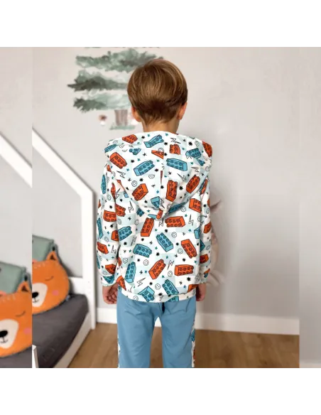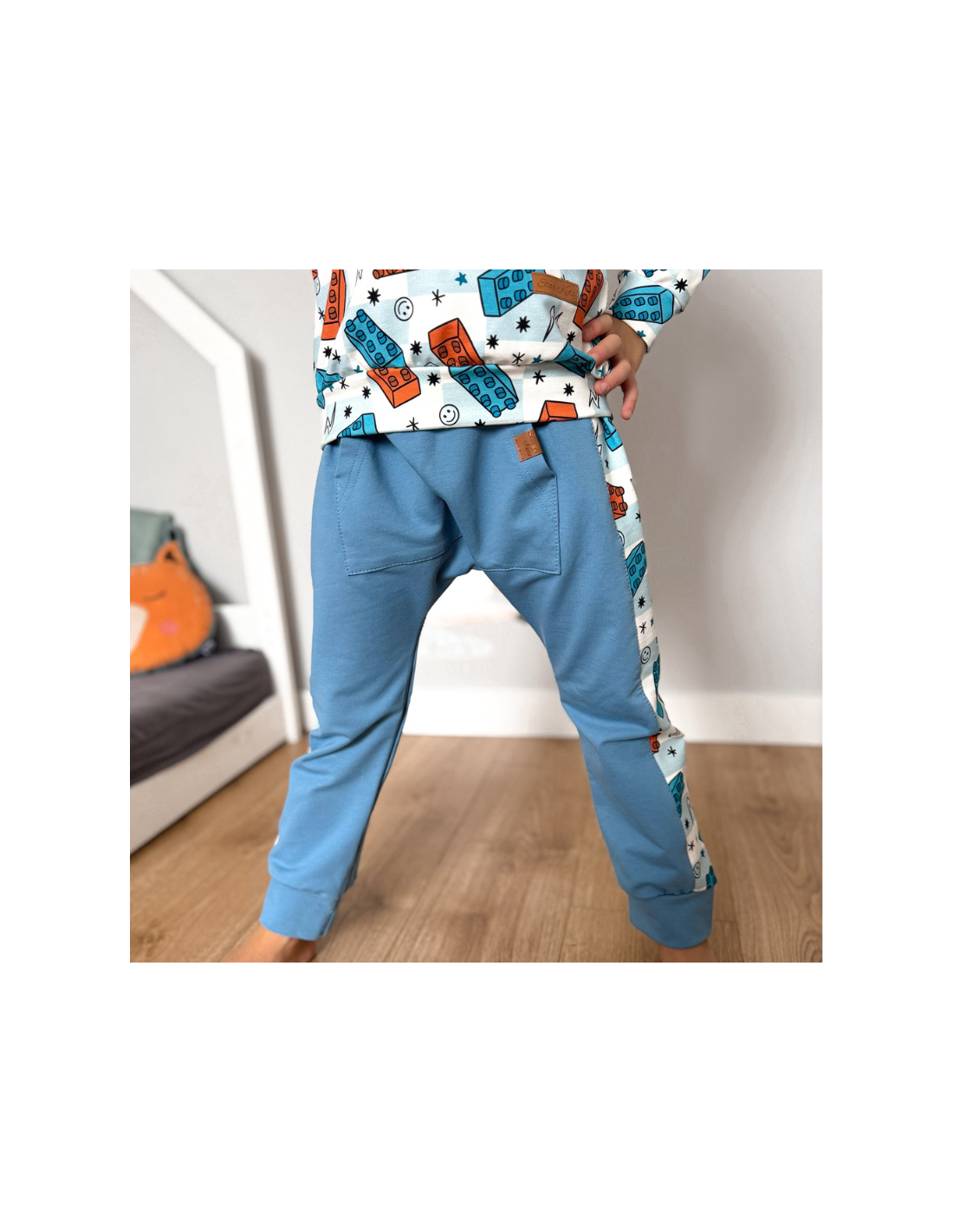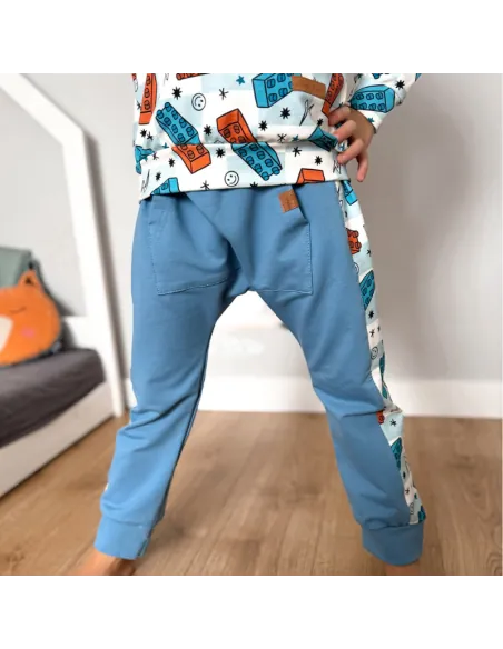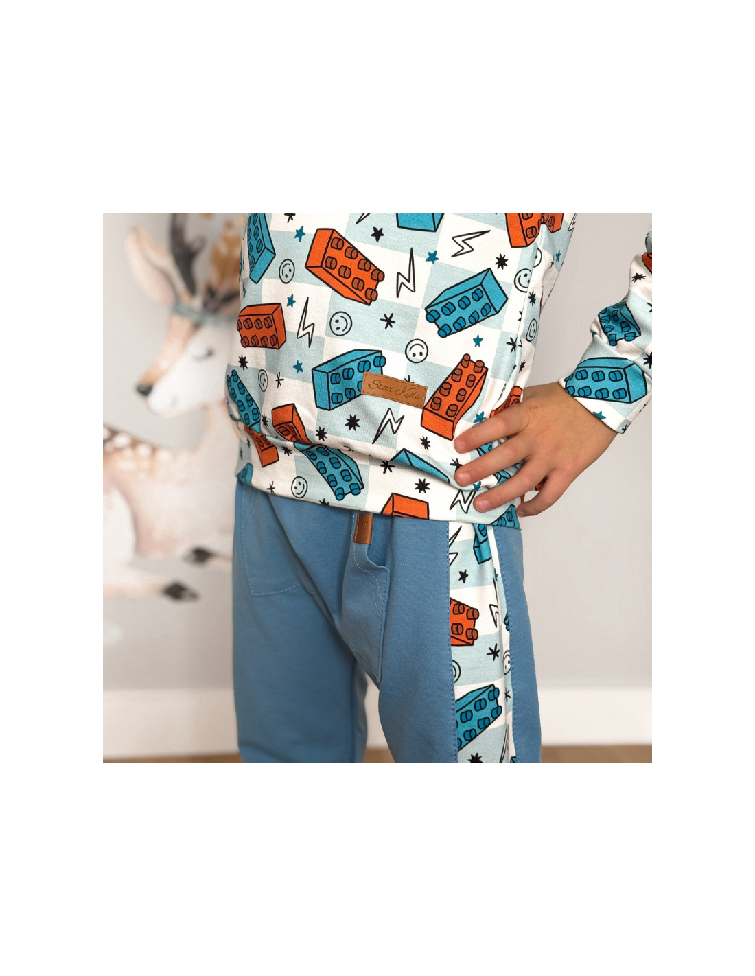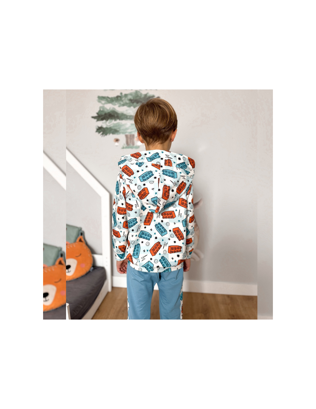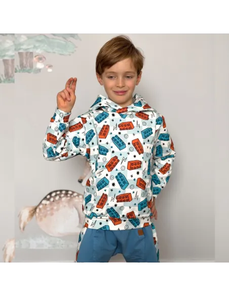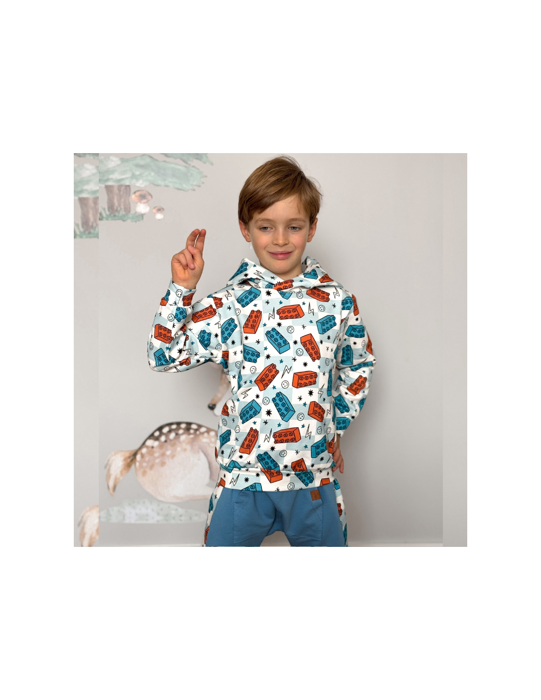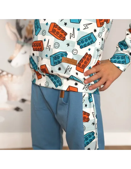 Komplet składa się z bluzy z kapturem i kieszonką kangurką oraz wygodnych spodni typu baggy. Całość ozdobiona jest energetycznym printem kolorowych klocków, które aż proszą się o wspólną zabawę i budowanie wielkich planów!