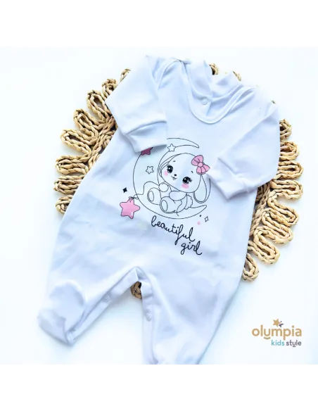 Śpioszki jednoczęściowe- gładkie, na którym wykonano trwały i mięciutki sitodruk. Tył gładki.Całość wykończona wąską lamówką. Stopki zakryte.