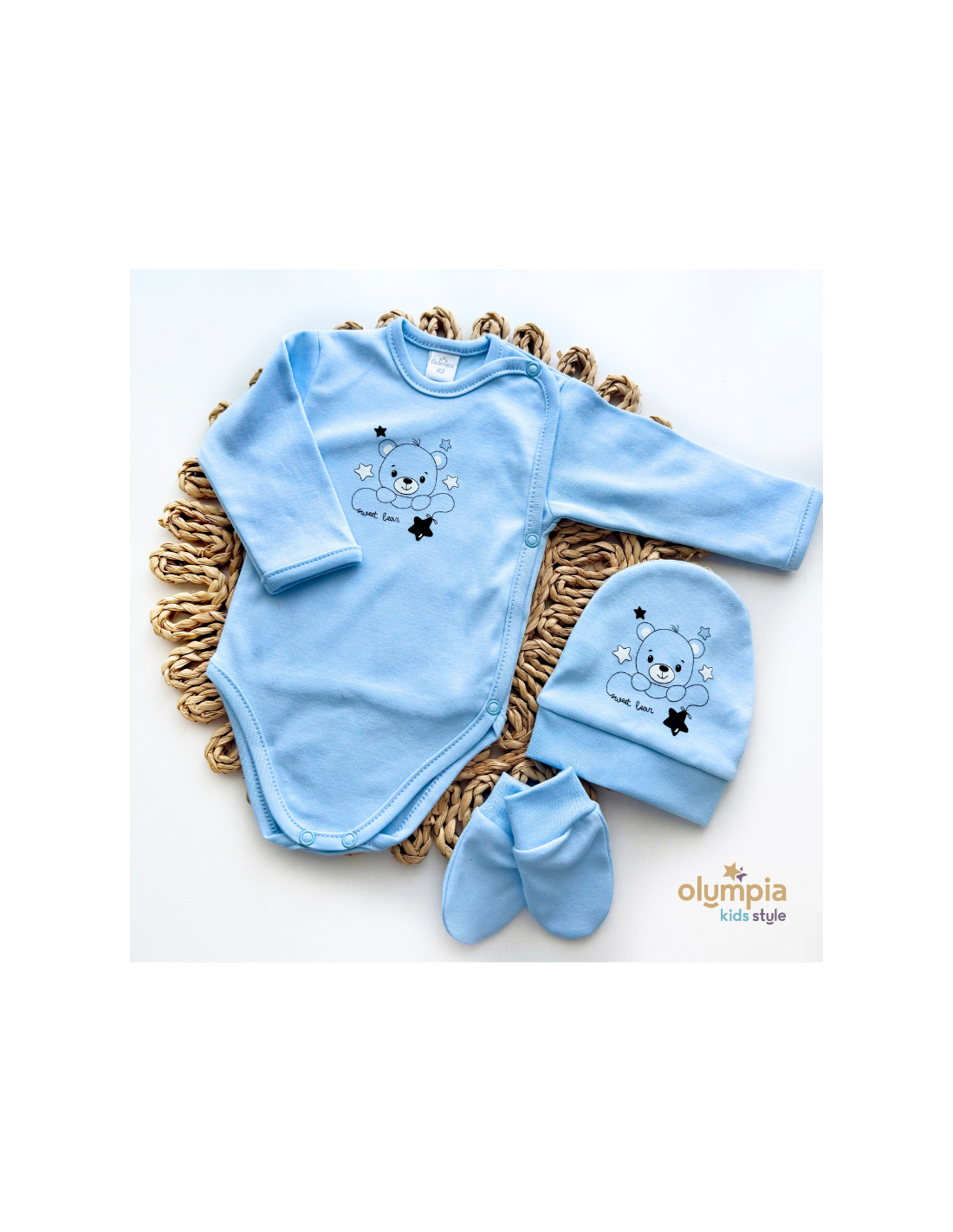 Bawełniana wyprawka dla niemowlaka 5 cz. Sitodrukna przodzie każdego elementu wyprawki . ( Nadruk może się różnić od nadruku na ze zdjęcia )