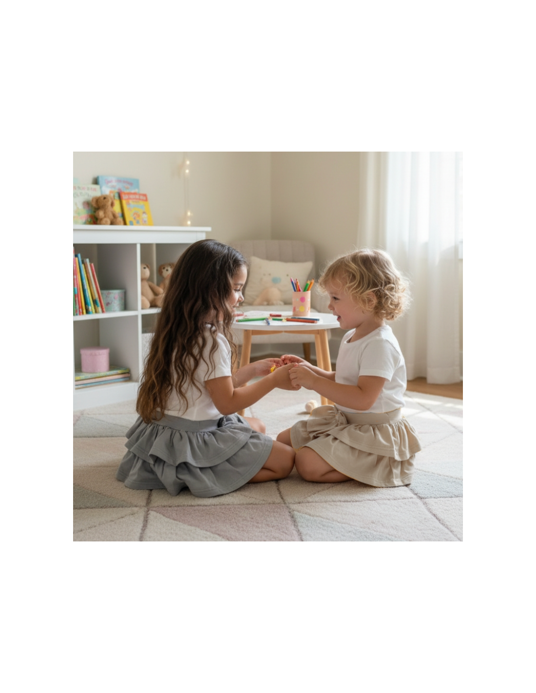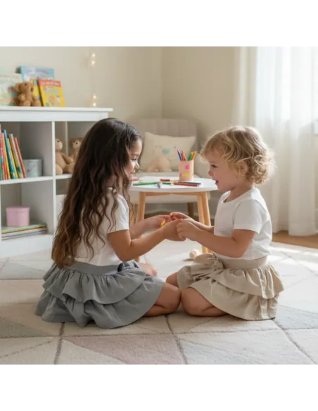 Urocza, zwiewna mini spódnica dla dziewczynki z 2 mocno marszczonymi falbankami pięknie się układa. W pasie wszyta elastyczna gumka.