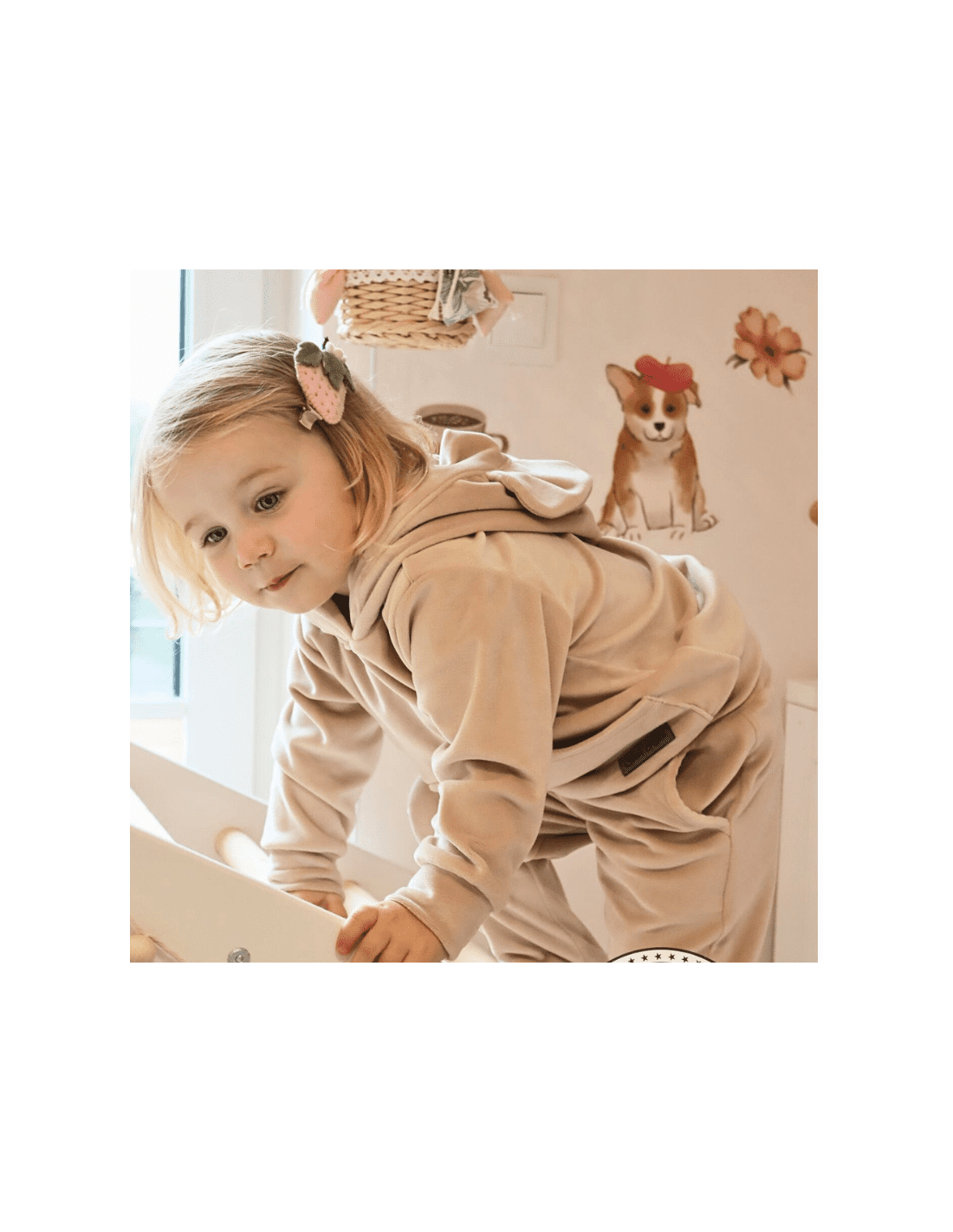 Dres wykonany z weluru, który pięknie połyskuje w świetle. Niezwykle mięciutki i delikatny. Dzieci uwielbiają się do niego tulić. Uszyty w Polsce z dbałością o wszystkie detale.