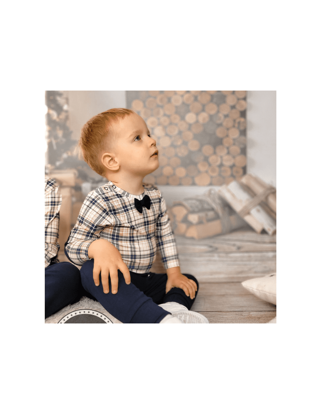 Komplet eleganckie body lub bluzka z muszką i spodenki z kolekcji świątecznej to idealna kreacja na Wigilijną kolacje czy imprezy okolicznościowe.