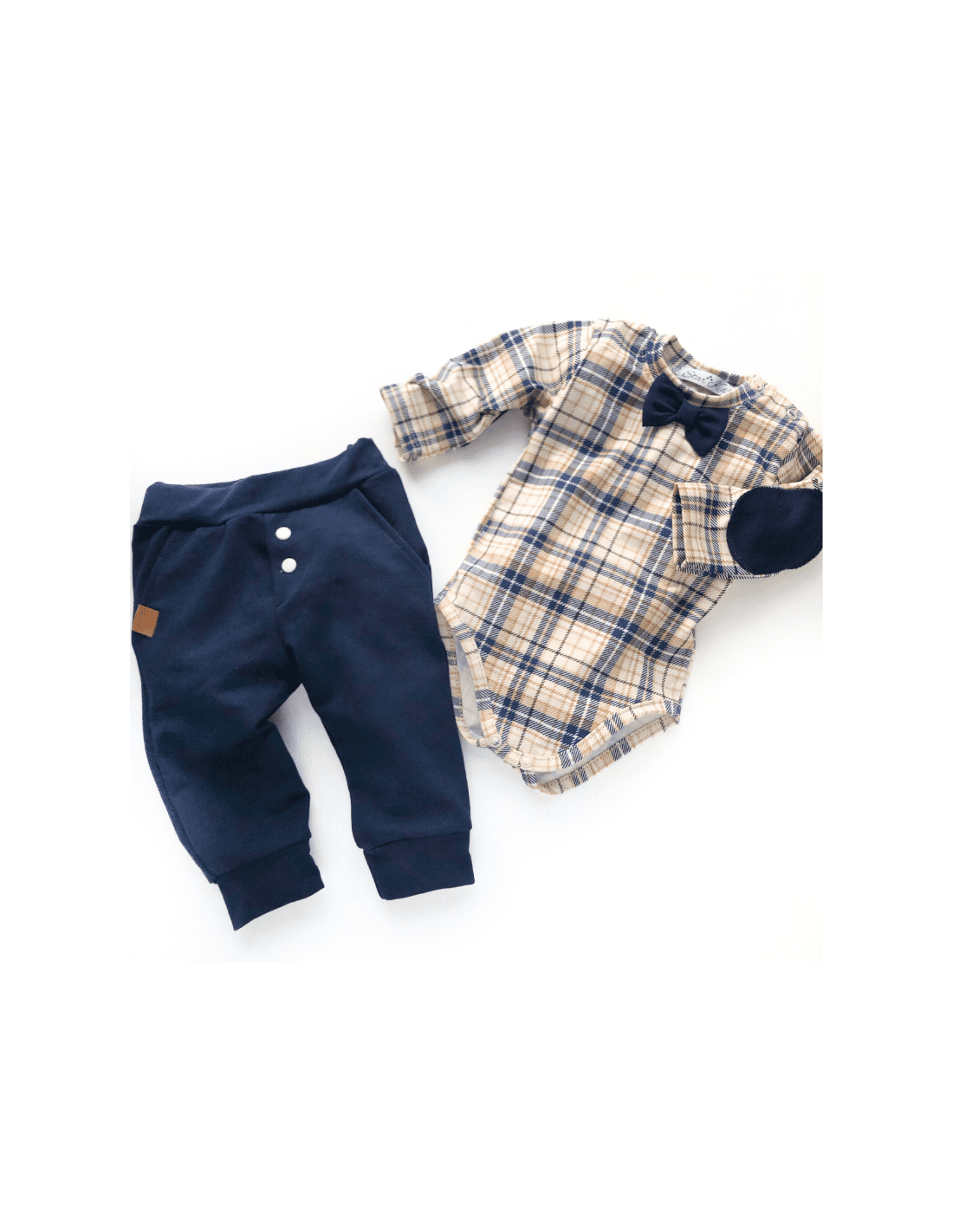 Piękne połączenie wygody i elegancji. Body z muszką pięknie kontrastują z granatowymi spodniami.